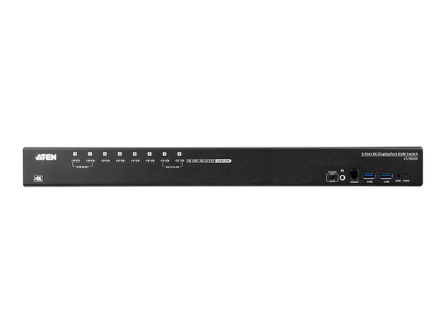 The ATEN CS19208 KVM switch can effectively access and control up to 8 DisplayPort computers from a single USB keyboard, USB mouse, and monitor console. With its dual interface console, users can choose between DisplayPort/HDMI video output supporting high video quality. To meet the needs of easy expansion and flexibility, the CS19208 can be cascaded to two levels to control up to 128 computers from a single console. Furthermore, the CS19208 supports multi-display function by stacking up to eight CS19208 units to compare and analyze information on 8 monitors at most, which substantially streamlines the working environment. Besides, the CS19208 comes with a built-in USB 3.1 hub delivering fast data transfer rates, allowing users to speedup operations and share USB peripherals instantly. For user-friendly port selection methods, the CS19208 offers push buttons, hotkeys, and OSD, bringing effortless and intuitive operations. To eliminate security concern, a two-level password authorization is available to enhance security protection for accessing and controlling computers.