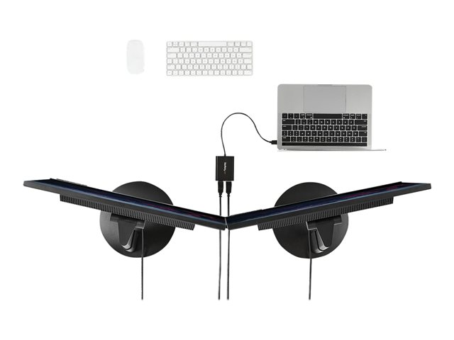 - Connects two DisplayPort monitors simultaneously for multitasking