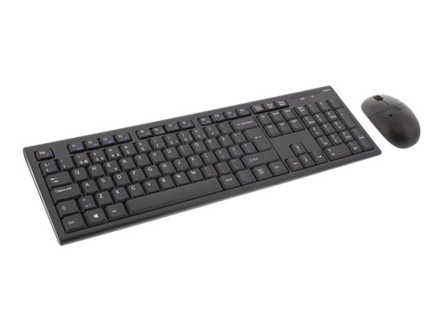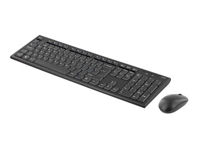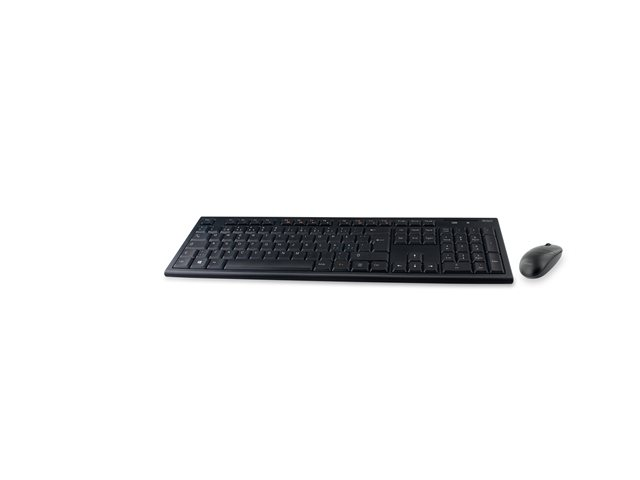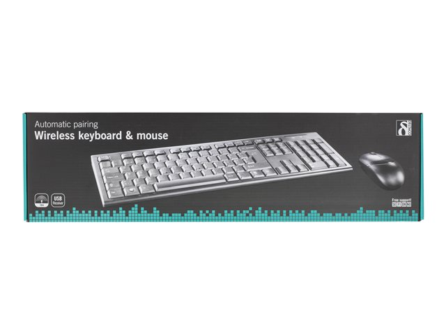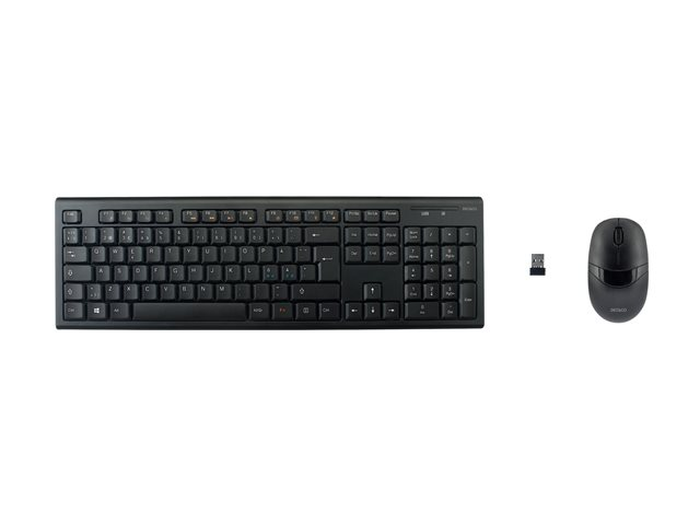 Trådløst tastatur og optisk mus med 3 knapper og scroll. Med automatisk parering trenger du bare å koble til USB-adapteren i ønsket uttak i PCen for å få alt til å fungere.