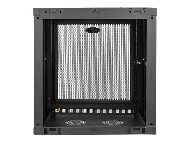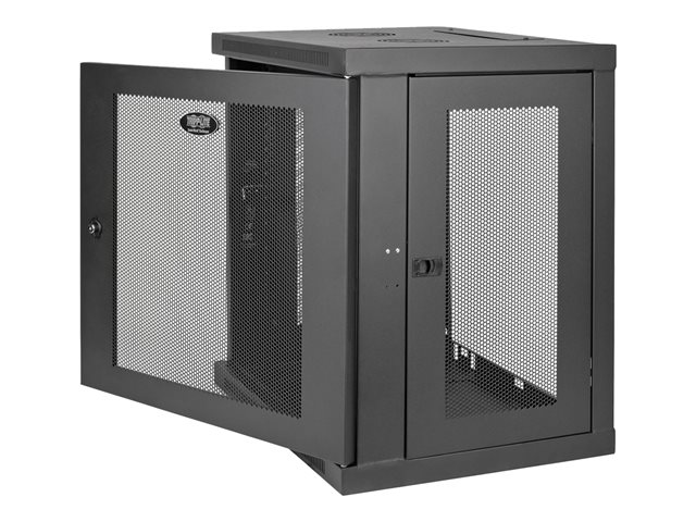 The SRW12U SmartRack 12U Low-Profile Switch-Depth Wall-Mount Rack Enclosure Cabinet is designed to house EIA-standard 19-inch rack equipment in network wiring closets, retail locations, classrooms, back offices and other areas with limited floor space where you need equipment to be secure, organized and out of the way. Constructed from heavy-duty steel with a durable black powder-coated finish, the cabinet has a maximum load capacity of 200 pounds. The side panels and front door lock securely to help prevent damage, tampering or theft. The front, top, bottom and removable side panels are vented, which allows air to flow freely and keep equipment cool. The reversible front door can open left or right by rotating the cabinet 180° before mounting. Convenient top and bottom ports allow easy cable routing. The SRW12U comes fully assembled and ready to mount to the wall, or use Tripp Lite’s optional SRCASTER rolling caster kit to make it a mobile rack. Square and threaded mounting holes and numbered rack spaces make equipment installation easy. The vertical mounting rails adjust in 7/8-inch increments to accommodate equipment up to 16.5 inches deep, such as network switches and patch panels.