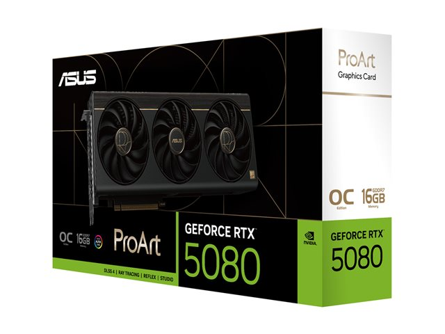 The ASUS ProArt OC Edition graphics card is designed for professionals seeking performance and versatility. This graphics card features the NVIDIA GeForce RTX 5080 processor, which provides a boost clock speed of up to 2730 MHz in OC mode. With 16 GB of GDDR7 SDRAM and a 256-bit bus width, it supports up to 4 monitors with a maximum external resolution of 7680 x 4320 pixels. Equipped with cooling technologies such as vapor chamber cooling and a triple fan design, this graphics card maintains optimal performance during intensive tasks.