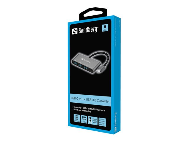 - Informasjon Med Sandberg USB-C til 3 x USB 3.0 Converter får du gode muligheter til å koble flere USB-enheter til datamaskinen med USB-C-port. Dermed kan du ha en ekstern harddisk, skriver og mus tilkoblet samtidig. USB-C-kontakten har en forlengelse for tilkobling av strømforsyning, slik at Macbook ikke vil gå tom for strøm mens dokken er tilkoblet.